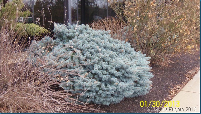 This bright blue shrub is a Picea pungens glauca “Globasa” – a compact shrub with blue needles.