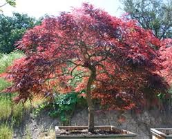 Japanese Maple are exquisite specimens in a small garden.  Foliage is deeply cut and can be green or red.  Many varieties are small, and weeping.  Some look more like a shrub and stay close to the ground to anchor an area.